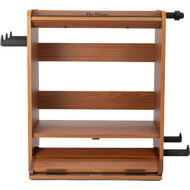 The pedalboard at the bottom holds several guitar-effect pedals and, at 8 inches wide, accommodates a variety of stompbox sizes. An opening down the center of the board makes it easy to route your wires and cables for a clean and practical layout. Hook-and-loop strips are included for securing your devices to the shelves, a popular attachment method that enables ease of rearrangement if you decide to make changes to your setup. When it's time to play, the pedalboard completely slides out of the workstation and can be positioned as close to or as far away from your amp as you choose. When you're finished playing you can slide the board back into the workstation and close the bottom door to shield your pedals from dust, debris, and mishaps.