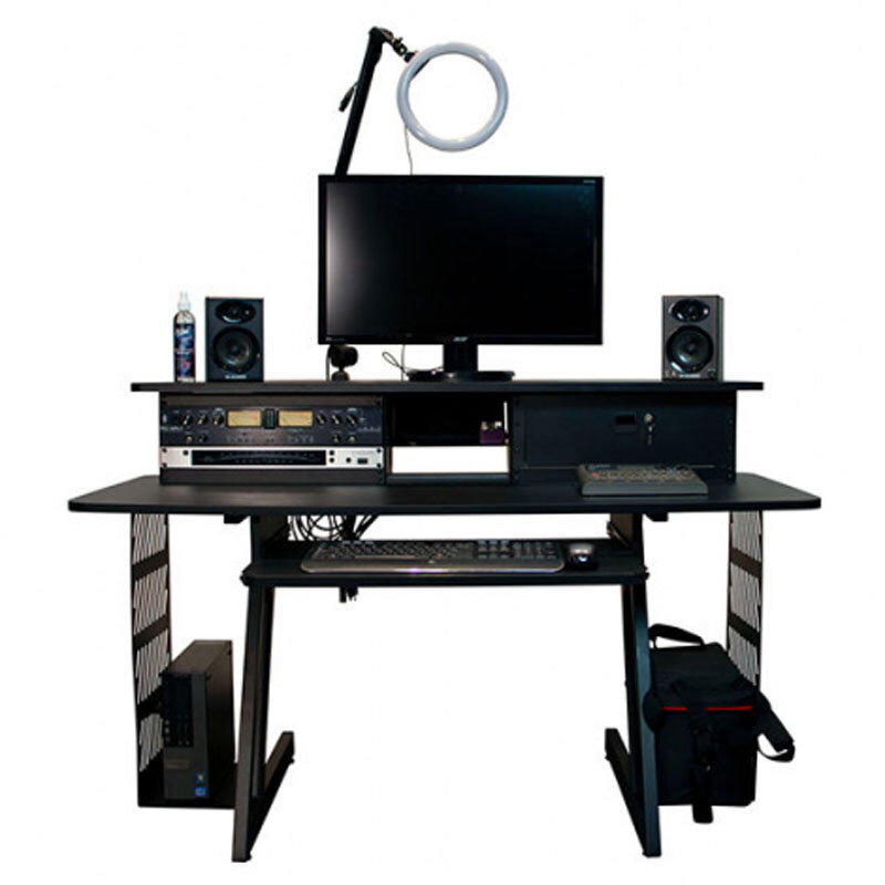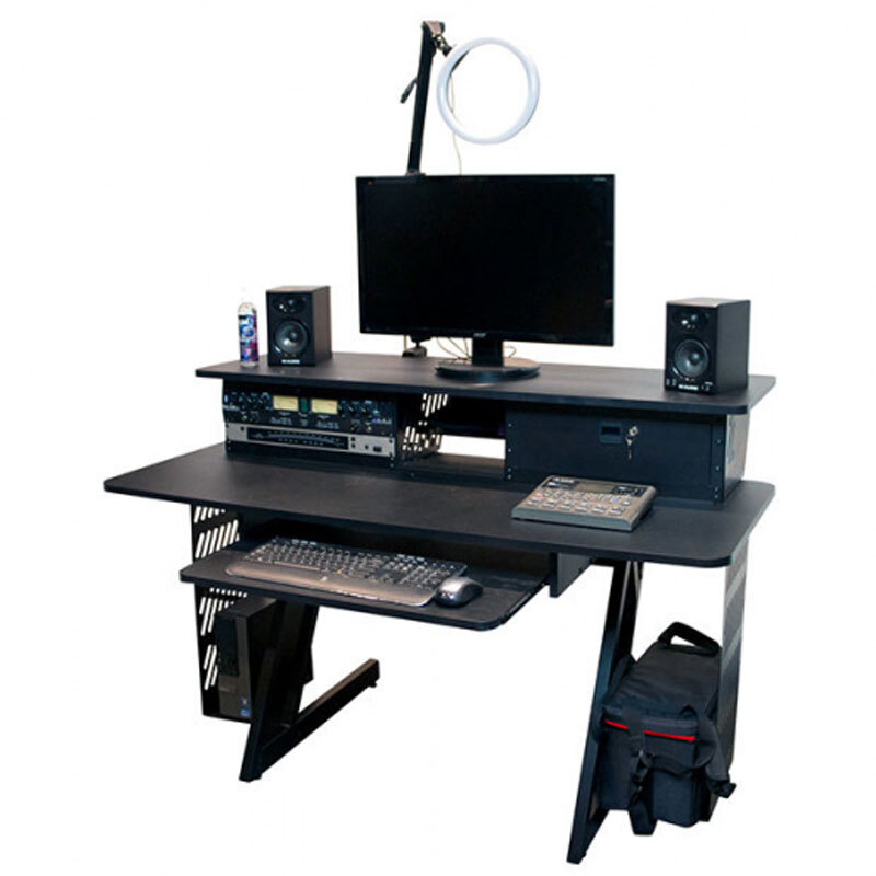 A slide-out keyboard tray and an elevated platform for a monitor and speakers increase work space and enhance operating comfort. In addition to a spacious desktop that supports a wide range of mixers and keyboard instruments, two 3U shallow racks provide a space for rack-mount components totaling 6U. To top off this efficient and orderly setup, a mobile device slot-stand and two computer holders keep delicate electronics safe and conveniently within reach.