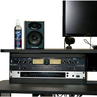- Ergonomic setup for a computer, monitor speakers, MIDI controller, rack gear, and other studio equipment