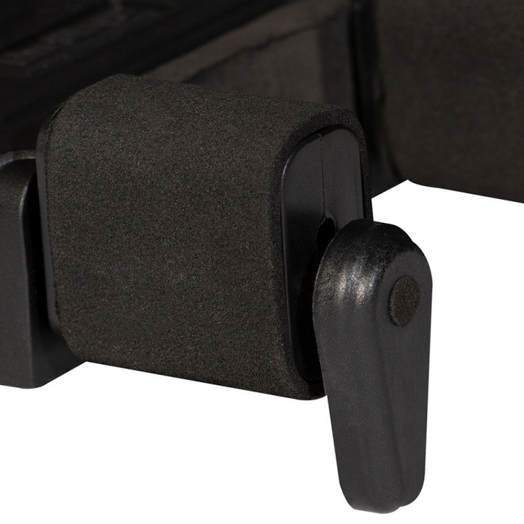As a guitar is lowered into the yoke, two swiveling arms automatically enclose the neck to prevent falls. The arms automatically release when the guitar is lifted. Heavy-duty construction ensures reliable instrument support. Padding on the yoke protects the guitar's finish and increases grip to keep the instrument safely in place. Hardware is included for ease of proper installation.