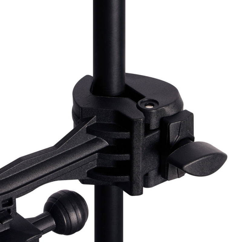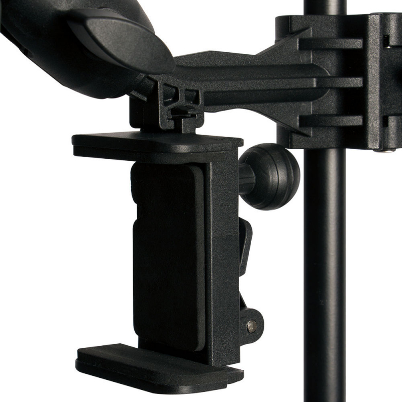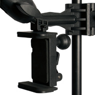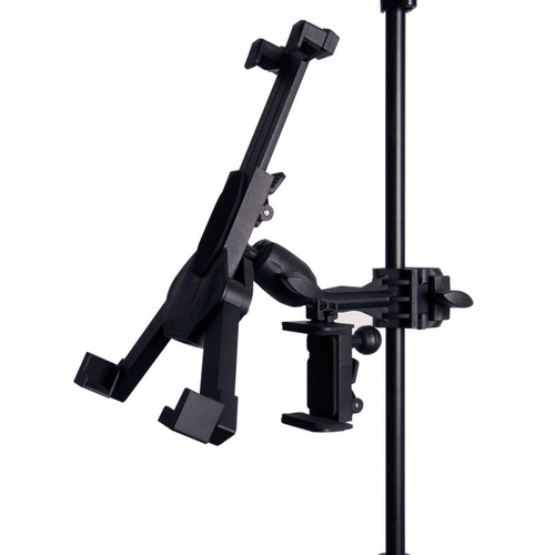 The tablet and cell holders, each of which boast protective padding at all contact points, adjust from 8" to 12" in height to 3.5" in width and 2.5"H x 4"W respectively. Meanwhile, the assembly adapter provides 180 degrees of tilt with a full 360 degree rotation and accepts any standard 5/8" - 27 threaded mic stand, or, with the included clamp, attaches directly to any .75" to 1" stand or desktop