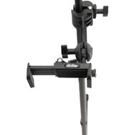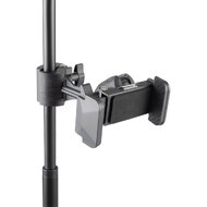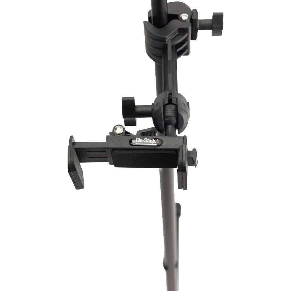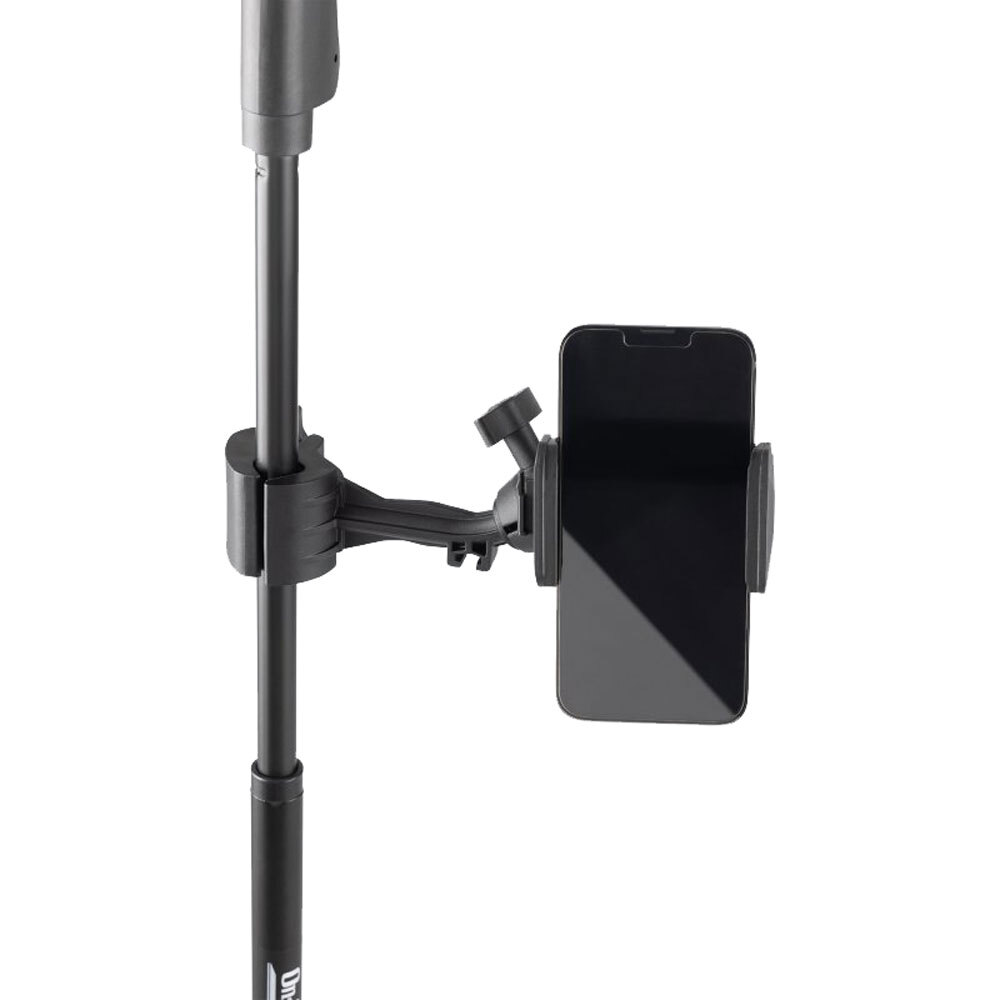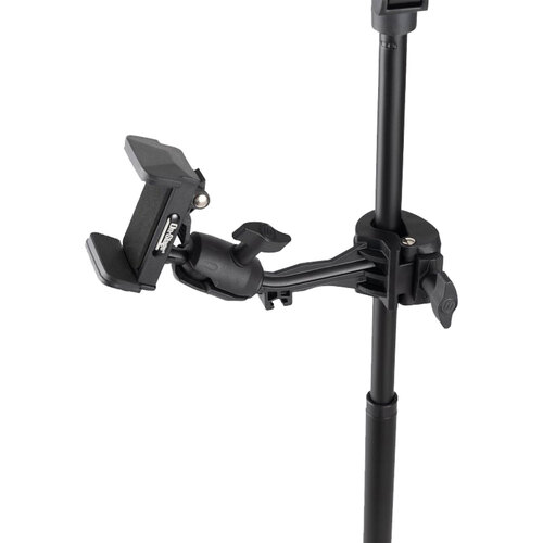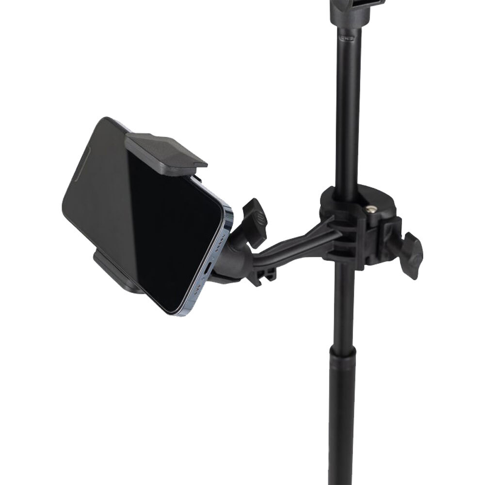 This space-saving holder makes it possible to mount a phone in a convenient location for practice, performance, streaming, or recording without setting up an extra stand. The ball joint on the phone clamp provides the option to mount the phone for use in portrait or landscape modes. It also enables rotation and tilting of the phone to further dial in just the right angle for comfortable viewing or for streaming or recording video. The phone clamp adjusts in size to ensure a snug fit for a wide range of phones up to 4 inches in width.