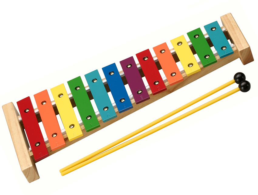 Opus Percussion 12-note (C to G) glockenspiel with natural wood frame and multi coloured keys. Comes with beaters.