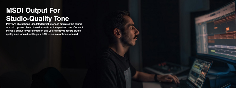 - Take advantage of Peavey's unique Microphone Simulated Direct Interface (MSDI) with XLR and USB output. Send a feed directly from the XLR output to the front-of-house (FOH). Or, flip the speaker defeat switch and silently record directly into your DAW.