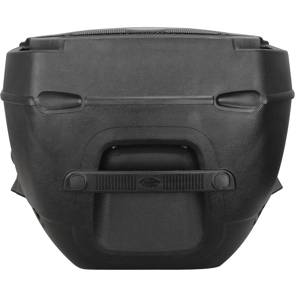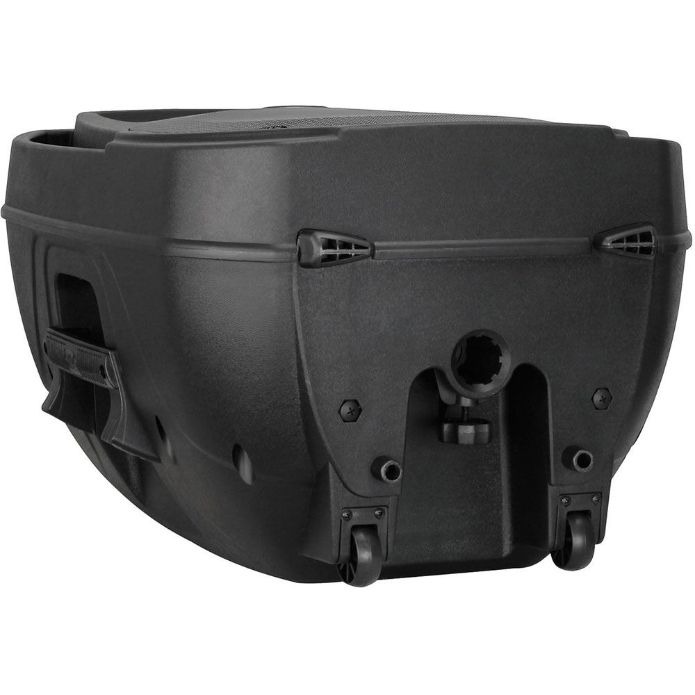 The lightweight yet rugged injection-molded plastic enclosure with molded-in stand mount cup facilitates portable use for live music or PA sound. The rounded profile cabinet has three handles for ease of portability. A black powder coated perforated steel grille provides woofer protection and a professional appearance.