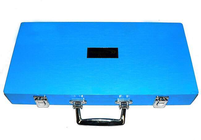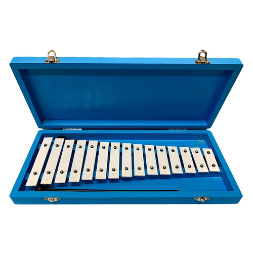 Percussion Plus 15-Note glockenspiel is fixed in a blue coloured wooden carry case. Comes with beaters.