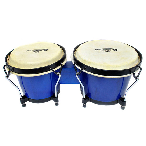 This Percussion Plus wooden bongo set comes in a gloss blue lacquer finish and features 6" & 6-3/4" natural hide heads, wood shell construction and black powder coated hardware.