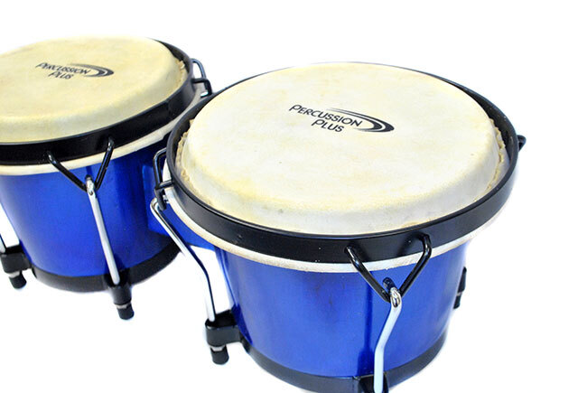 This Percussion Plus wooden bongo set comes in a gloss blue lacquer finish and features 6" & 6-3/4" natural hide heads, wood shell construction and black powder coated hardware. This package also includes a black canvas bongo carry bag to help you transport and protect your bongos.
