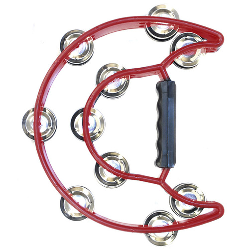 This Percussion Plus hand percussion sound effect is a PVC shell half moon tambourine in red and has 10-Double rows of jingles. Enjoy making beautiful music with Percussion Plus.