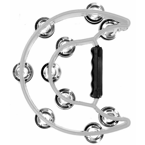 This Percussion Plus hand percussion sound effect is a PVC shell half moon tambourine in white and has 10-Double rows of jingles. Enjoy making beautiful music with Percussion Plus.