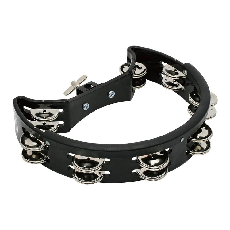 This Percussion Plus hand percussion sound effect is a PVC shell half moon tambourine in black and has 8-Double rows of jingles. It has a fixed mount to attach to a post. Enjoy making beautiful music with Percussion Plus.