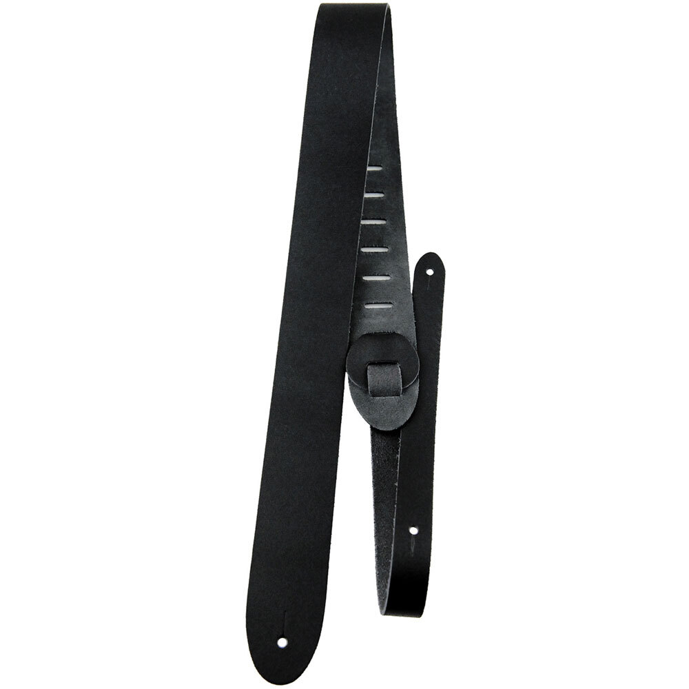 This is a 2" wide guitar strap with an adjustable length of 41" to 56" and is made with a basic black leather.