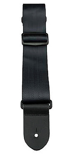 This is a 2" wide guitar strap with an adjustable length of 39" to 58" and is made with a Black seatbelt material that has black leather ends.
