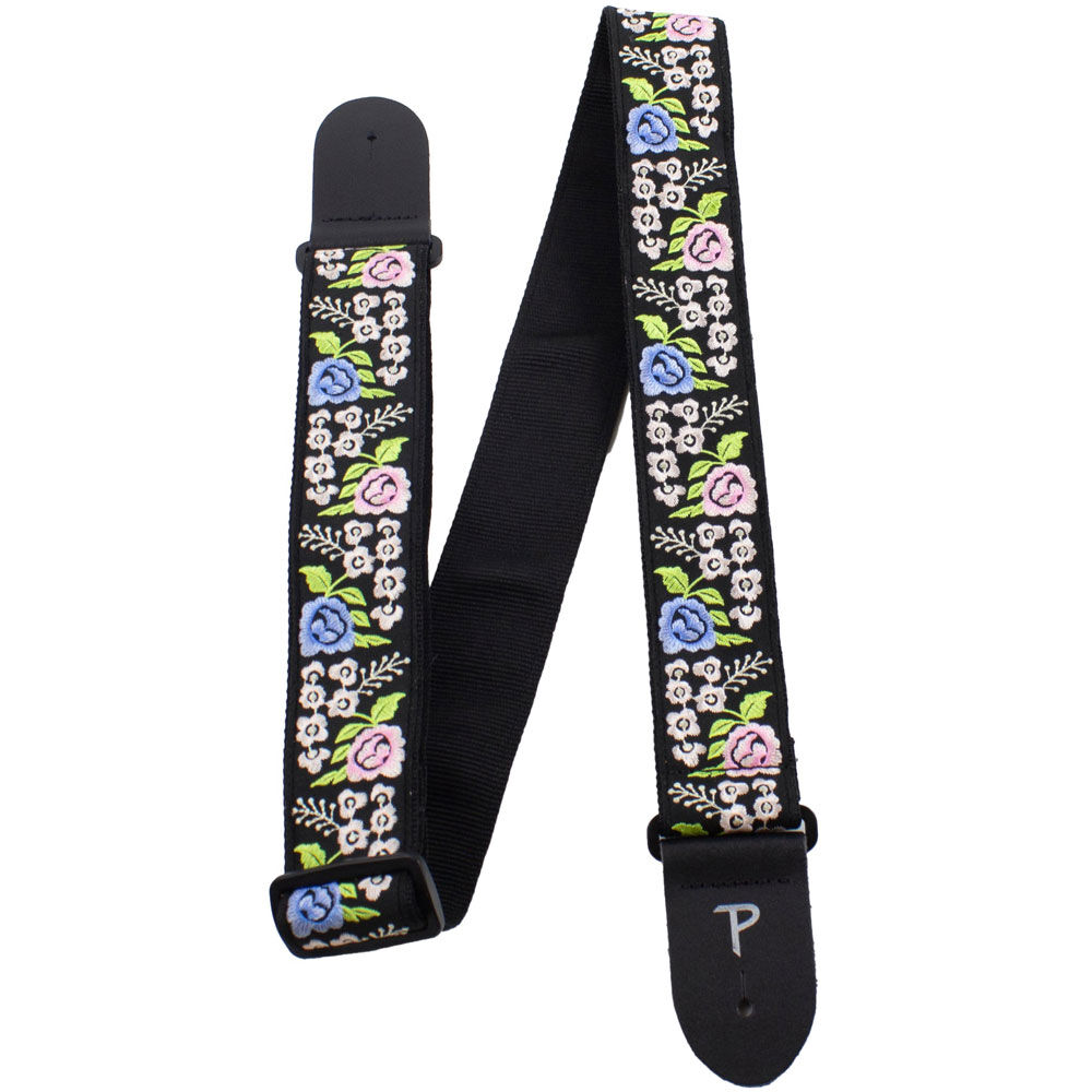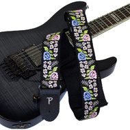 Perris 2" wide guitar strap made from high quality jacquard ribbon sewn on tubular webbing with Black Genuine leather ends. From our "Stitched Collection" it features a Black Floral Trail Embroidery Design. It is adjustable in length from 39" to 58"