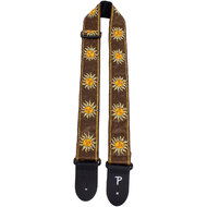 This is a 2" wide guitar strap made from high quality jacquard ribbon sewn on tubular webbing with Black Genuine leather ends. Featuring a Suns on Brown Design. It is adjustable in length from 39" to 58"