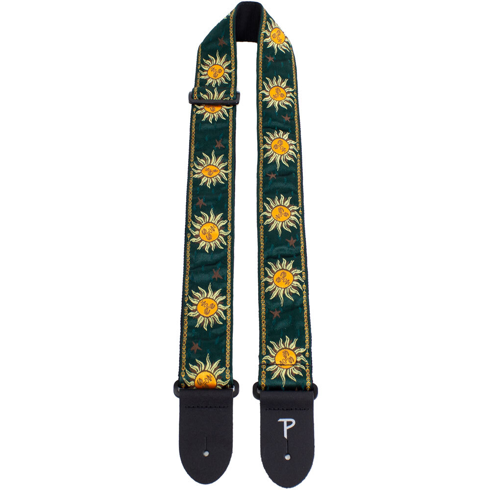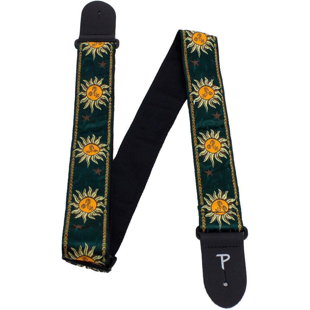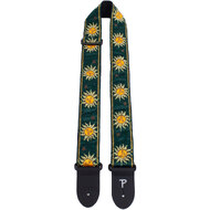This is a 2" wide guitar strap made from high quality jacquard ribbon sewn on tubular webbing with Black Genuine leather ends. Featuring a Suns on Emerald Green Design. It is adjustable in length from 39" to 58"