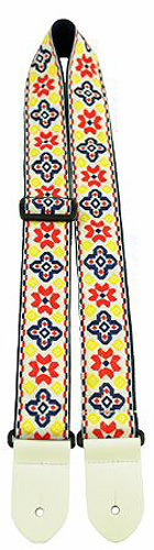 2" wide guitar strap made from high quality Jacquard ribbon sewn on tubular webbing with leather ends. Red, yellow & blue flowers design. Adjustable length from 39" to 58".