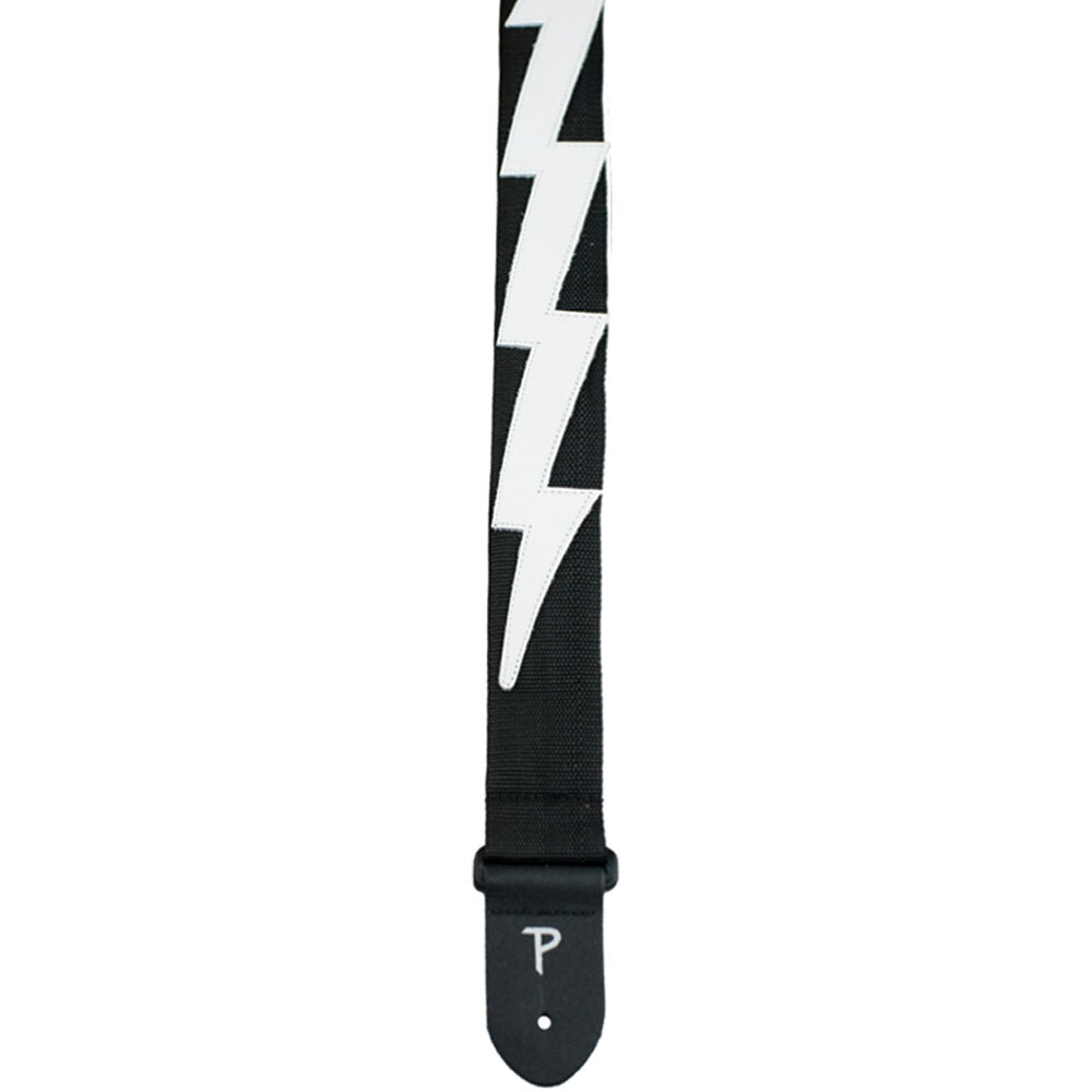 This is a 2" wide Poly Pro guitar strap with white leather "Lightning Bolt" design & leather ends Adjustable length 39" to 58".