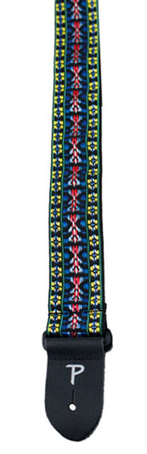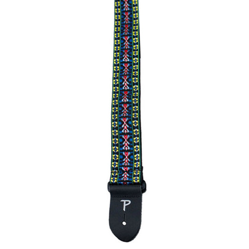 This 2" wide Poly Pro guitar strap is made with a Blue, Red & Yellow "Hootenanny" style fabric and is fully adjustable with leather ends. Adjustable length from 39" to 58"
