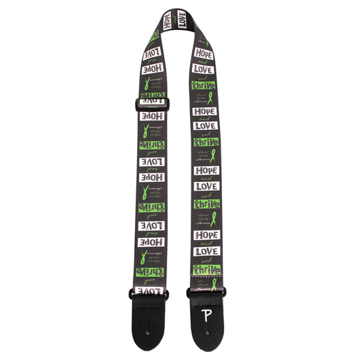 This 2" wide guitar strap is made from Polyester webbing with Heat Transfer "Hope & Love & Thrive" design and leather ends. Adjustable length from 39" to 58"
