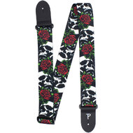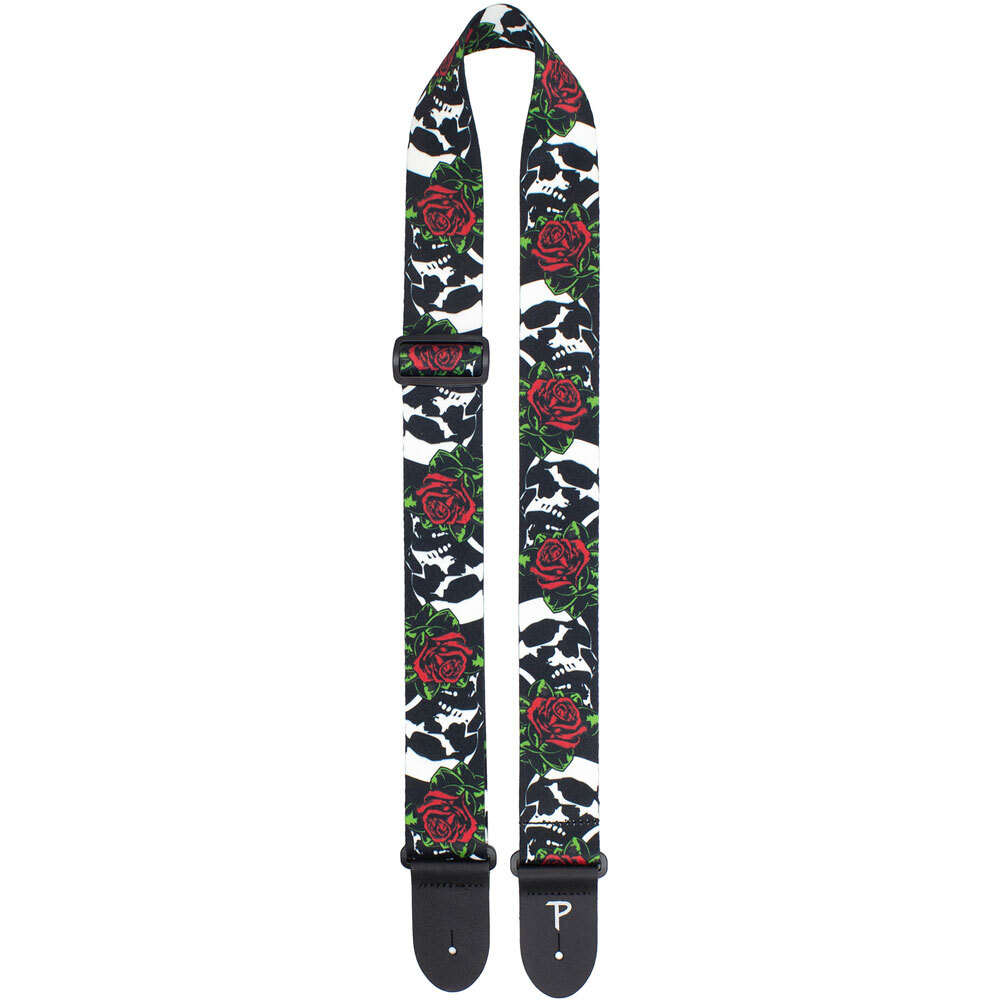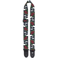This is a 2" wide guitar strap with "Skulls & Roses" heat transfer design on polyester webbing. Adjustable length 39" to 58"