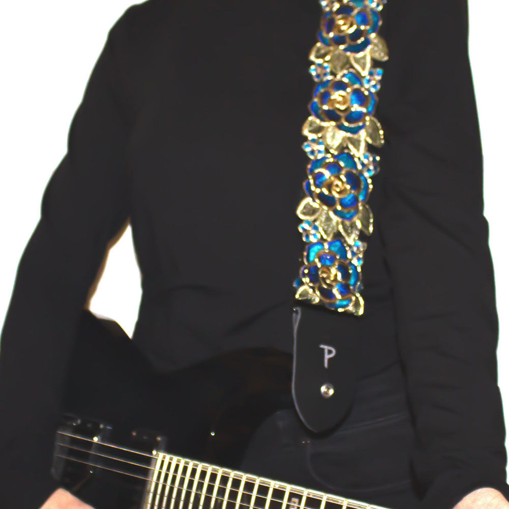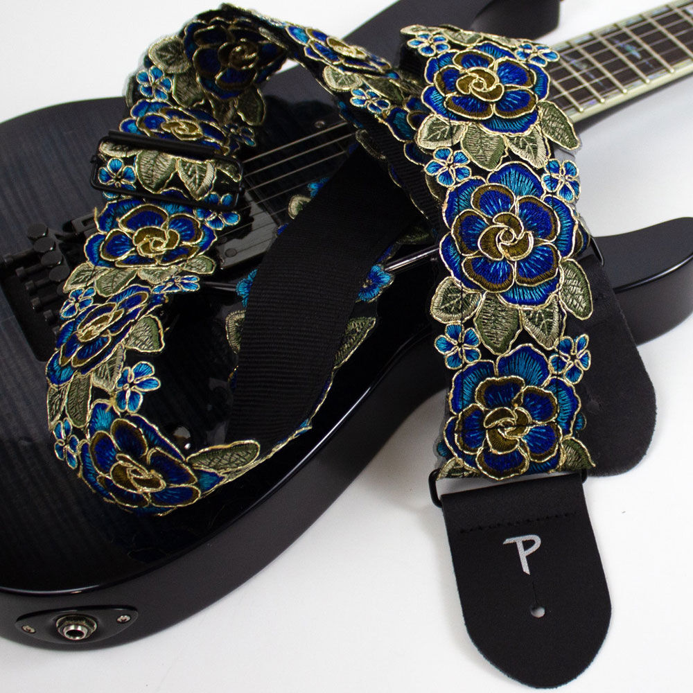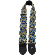 Perris 2" wide stitched 3D Lace Ribbon guitar strap in Blue & Gold Floral Design. This strap is adjustable in length from 39" to 58".