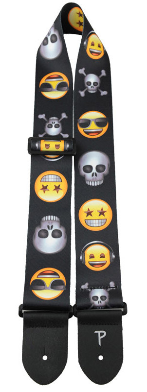 2.5" Official Licensing Emoji Skulls And Friends On Black Heat Transfer Design on Polyester Webbing Guitar Strap. Adjustable length 39" to 58"
