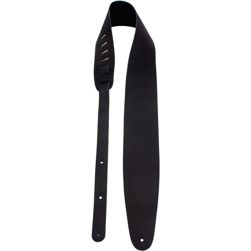 This is a 3.5" wide guitar strap with an adjustable length of 41" to 56" and is made with a basic black leather.