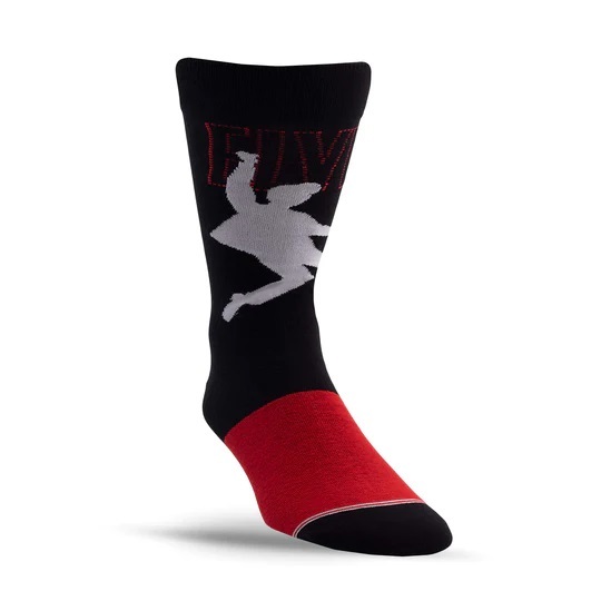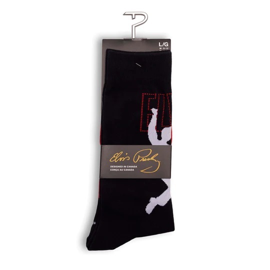 - Knit in stage lights Elvis logo and dancing Elvis silhouette on center front of leg with bold stripe on foot