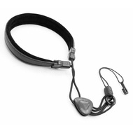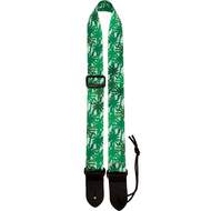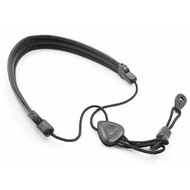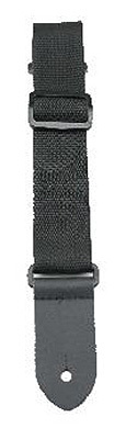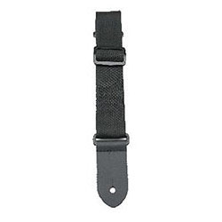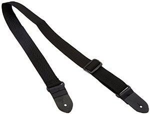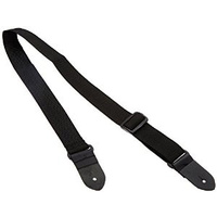 1.5" wide nylon ukulele strap in black with leather ends and is adjustable from 23" to 38".