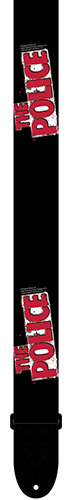 This is a 2" wide licensed The Police guitar strap with black background and "The Police" logo design in red. This strap is made with the adjustable length of 39" to 58" and is made with the design heat transferred onto polyester webbing.