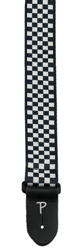 2" wide guitar strap made from polyester webbing with Heat Transfer "White/Black Checkers" design and leather ends. Adjustable length from 39" to 58"