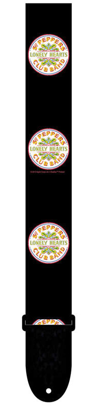 2" wide polyester "Sgt Peppers" licensed Beatles guitar strap with vegan ends. Adjustable length from 39" to 58"