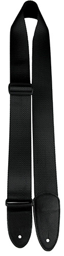 2" wide guitar strap made from black heavy nylon webbing with soft deluxe Italian Leather ends. Adjustable from 39" to 58".