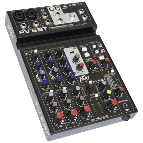 The PV 6 BT mixer includes 2 channels of reference-quality mic preamps, 2 direct outputs for recording, a stereo input channel, and a dedicated media channel, and Bluetooth wireless input and high quality digital effects. Other features include 48 volt phantom power, dual selectable control room outputs, built-in stereo compressor, an on-board selectable high impedance preamp equalized for guitar, 3-band EQ per channel with bypass, signal/clip indicators, and a stereo master LED meter bridge.