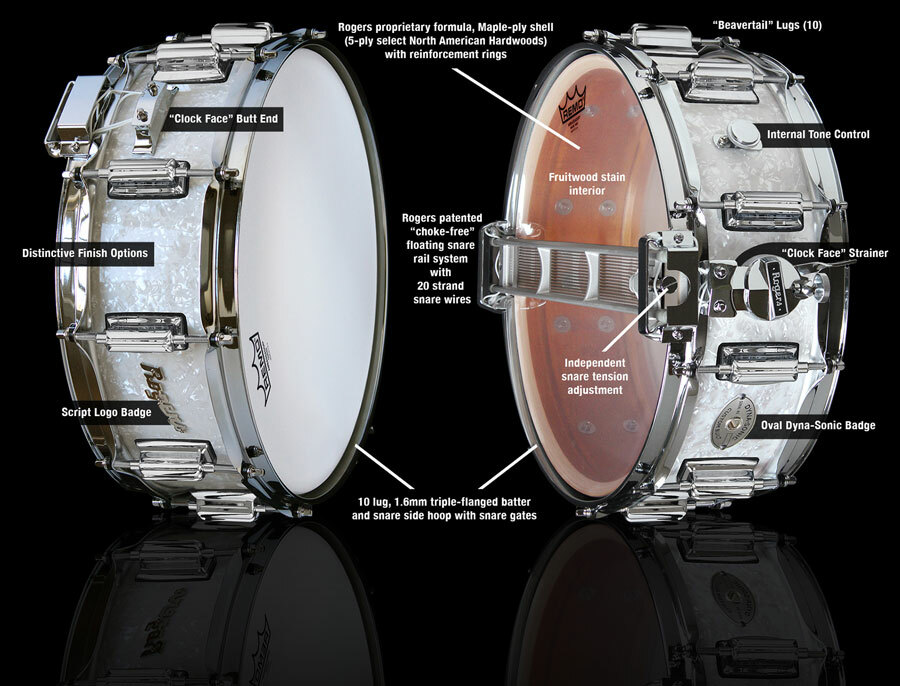 Roger's product designer, Joe Thompson said it best in his Jan 16, 1962 patent application for the Dyna-Sonic snare rail system: "The goal of this invention is to provide a drum with 'floating snares', which can be tensioned without putting pressure on the head, on a drum with no snare beds."