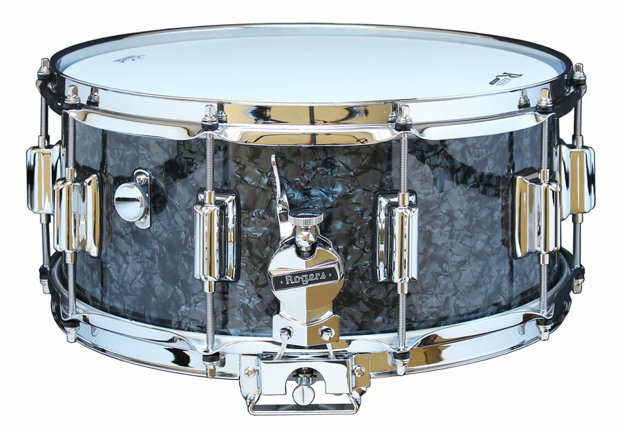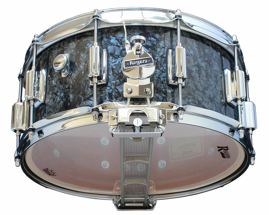 Rogers Beavertail Snare Drum in Black Diamond Pearl - Model No. 37BP is deep, dark and handsome. Black Diamond Pearl, on beautiful display across the extended depth shell of the Model 37-BP! Already a fave among Rogers' fans, it is now available in Rogers' reborn Beavertail Dyna-Sonic Series.