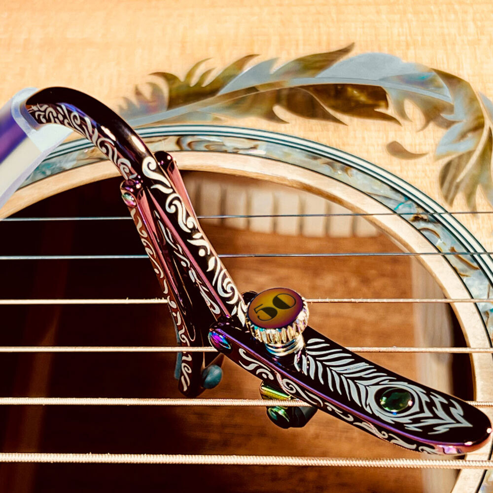 The "Violet Sky" combines a variety of technical and aesthetic features to create a truly unique capo. Our violet is a deep and lush shade with a captivating shine made possible by our high-tech titanium finish. We then brand it with an original design we call "Sequoia" because the pattern resembles a redwood frond, something we relate to here in Northern California. Accented with iridescent hardware, the colors and designs meld together into something truly special. The first release in our Anniversary collection and a beautiful violet sunrise for many things to come this important celebratory year.