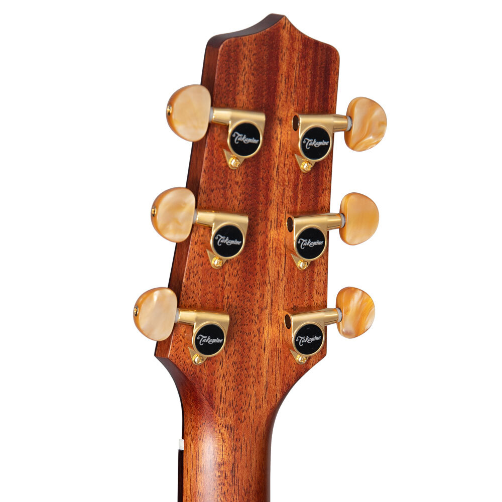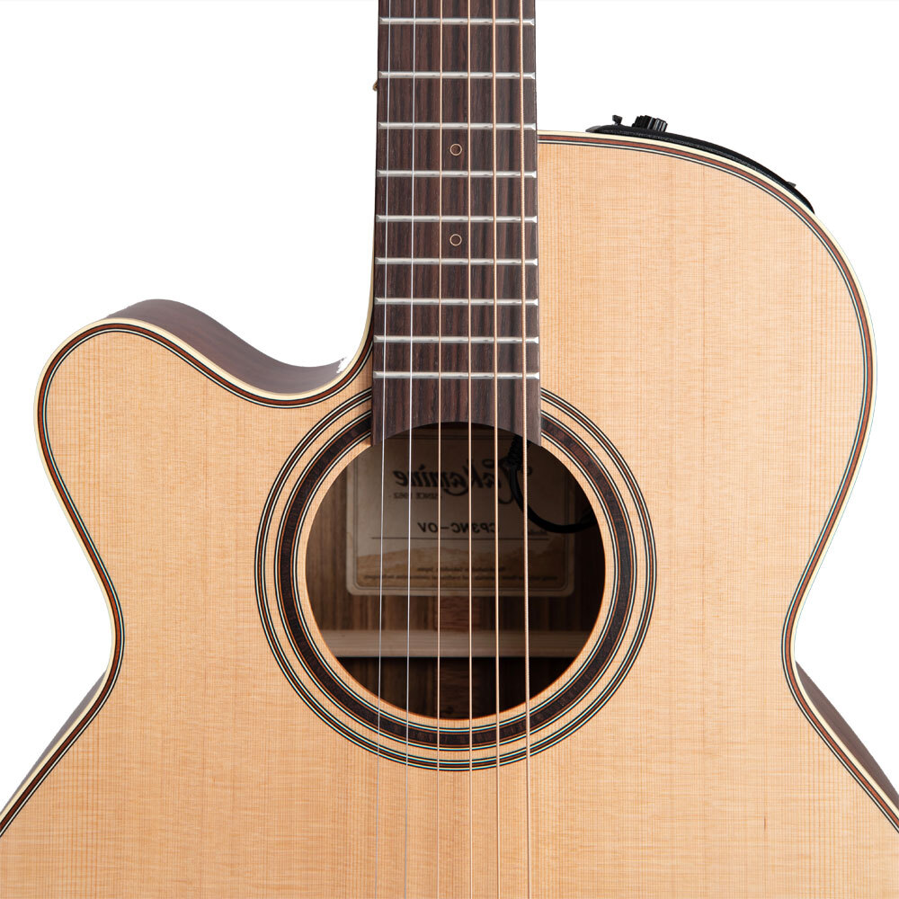 The solid cedar top features hand-scalloped X bracing and ivory binding, with dark purfling and a gorgeous concentric-ring rosette with wood marquetry. An elegant Venetian cutaway offers optimum access to the upper registers. The unique Takamine split-saddle bone bridge provides faultless intonation and excellent acoustic coupling to the top.