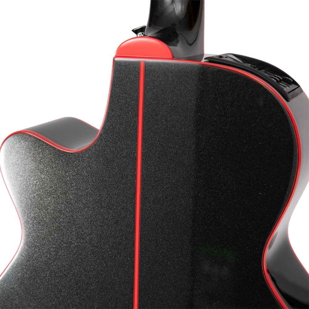 This bold new guitar is a clear nod to the iconic vibe of the '80s music scene, featuring eye-catching, eccentric cosmetics and a stunning metallic black paint job with a bold reddish body binding.