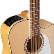 The guitar has a reinforced spruce top that is double-x braced to handle the additional string load, while projecting with clarity and sweetness via a flame maple body. The neck is also made of maple for additional structural rigidity. It is artfully appointed with specialized wood binding, purfling, and rosette that echos the roots of the music it was designed to create. The classic "reverse mountain" inlay at the 12th fret and striking pearloid pickguard complement the look of this guitar.