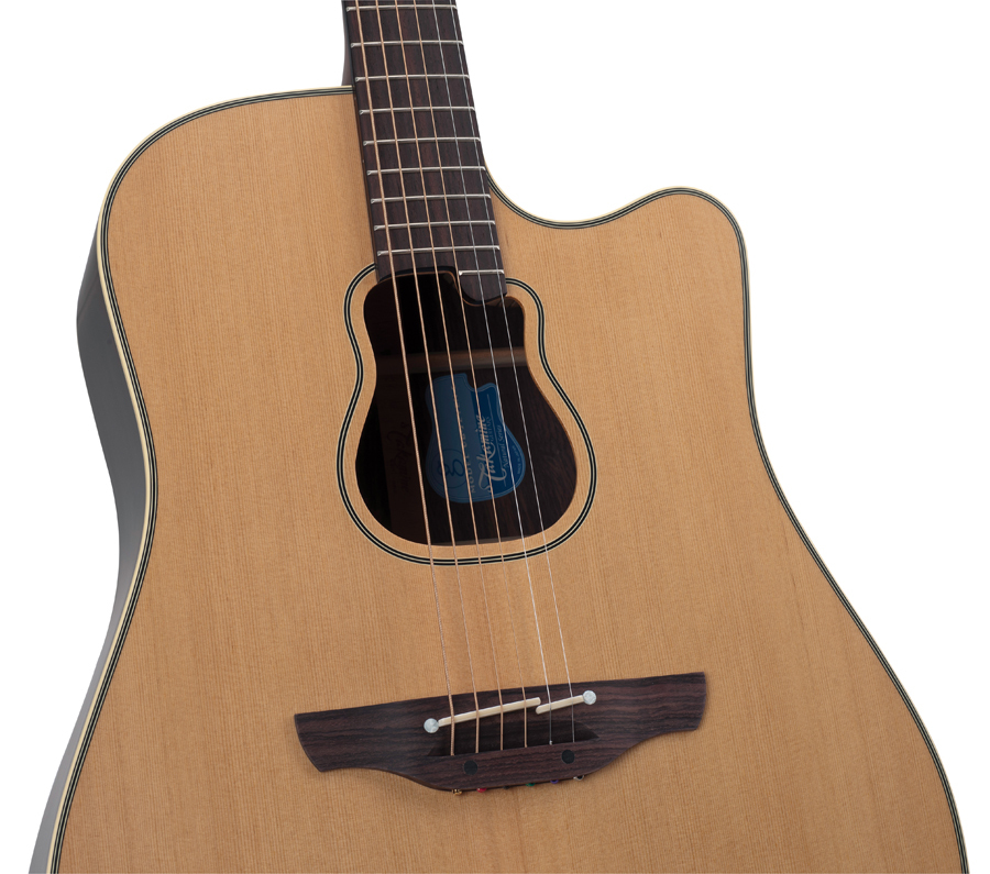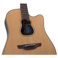 This model matches a solid cedar top, finished in a silky smooth natural satin finish, to a solid rosewood back and features a unique soundhole that mirrors the shape of the guitar. Sonically, the guitar performs well in soft fingerstyle passages and aggressive strumming. The mahogany neck is joined to the body with a traditional, ultra strong dovetail joint.