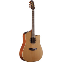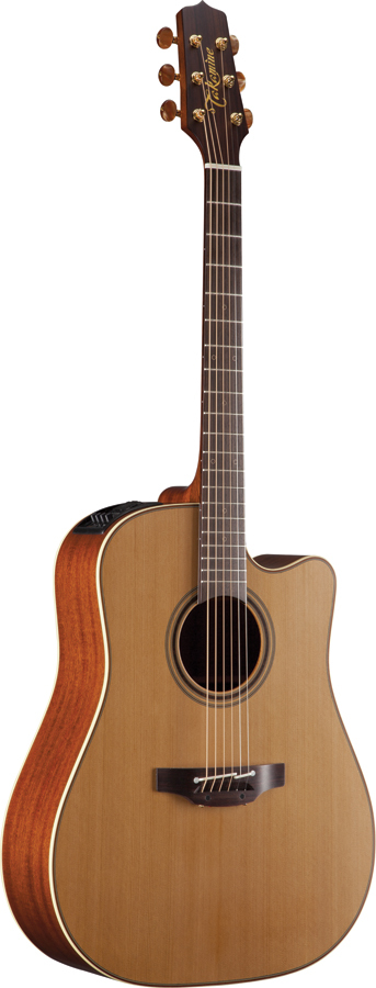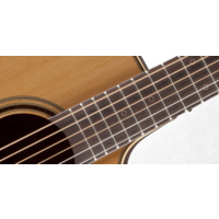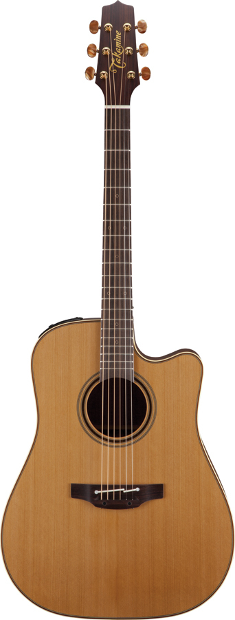 The solid cedar top features hand-scalloped X bracing and ivory binding, with dark purfling and a gorgeous concentric-ring rosette with wood marquetry. An elegant Venetian cutaway offers optimum access to the upper registers. The unique Takamine split-saddle bone bridge provides faultless intonation and excellent acoustic coupling to the top.