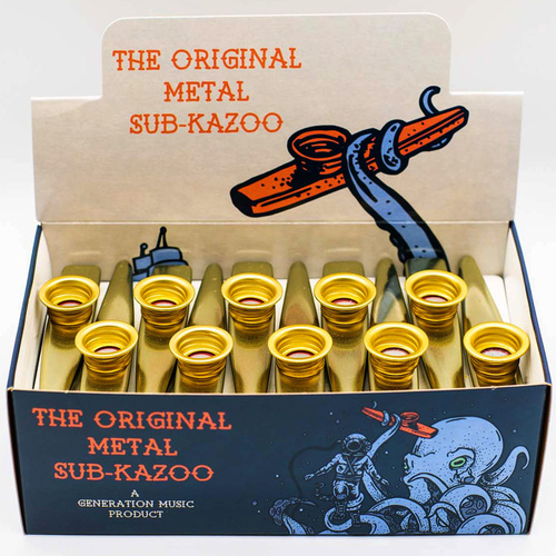 The original Generation metal Sub kazoo comes in a durable, hygenic finish. A natural skin tone diaphragm gives it powerful tone. A fan-favourite the world over. This is sold as a 30pce Retail Counter-top Display only.