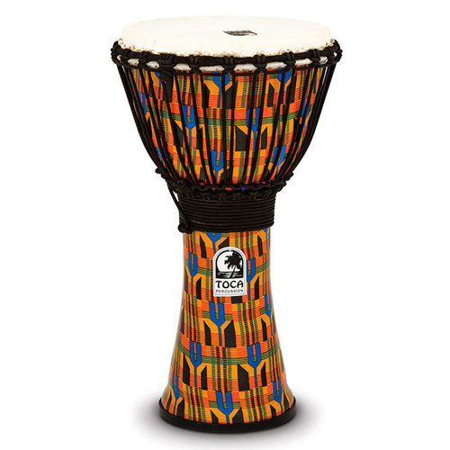 Freestyle II Rope Djembes now take the next step in performance with the installation of all-weather synthetic heads. The new heads eliminate the stretching, drying, and loss of pitch that can occur with natural skin heads due to changes in weather conditions. Thus they offer greater consistency in sound. Synthetic heads can also be tensioned over a wider range, making them able to produce higher, crisper slaps and deeper bass tones. Freestyle II Rope Djembes have also been improved with an increased number of rope runners that allow for improved tuning.