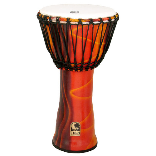 The new heads eliminate the stretching, drying, and loss of pitch that can occur with natural skin heads due to changes in weather conditions. Thus they offer greater consistency in sound. Synthetic heads can also be tensioned over a wider range, making them able to produce higher, crisper slaps and deeper bass tones. Freestyle II Rope Djembes have also been improved with an increased number of rope runners that allow for improved tuning.