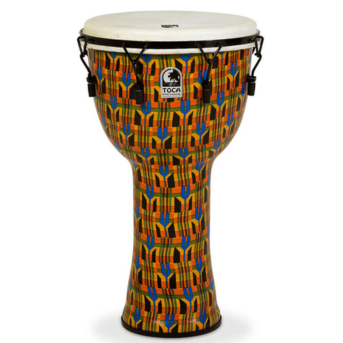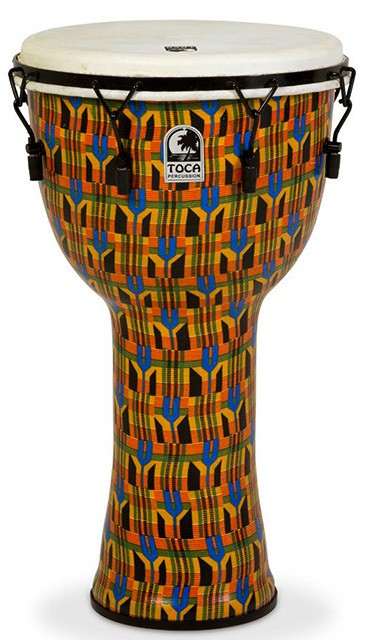 Once reserved for kings, the Kente Cloth remains a proud symbol of Ghana's Akan people. Toca has taken this brightly coloured material and wrapped it around the lightweight and durable synthetic shell of the Freestyle Djembe.