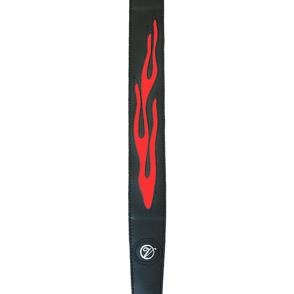 Vorson Black Leather Guitar Strap with Stitched Red Flame Design